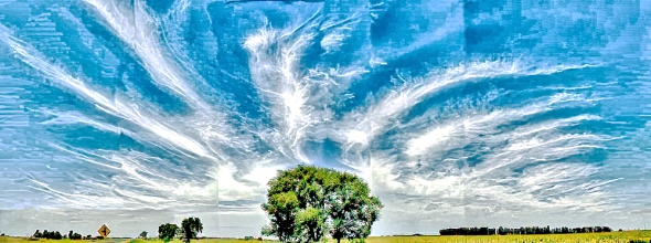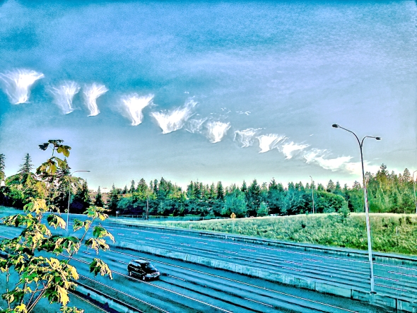 25 - Definitely can't pull the wool on this one.On occasion when a middle level cloud front is moving into an area where a Father Ship is sitting, the leading edge of the front will start to pick up on the Radionic radiations and push a condensated array of tendrils out in front of the advancing front. Just for fun, the following sequence of four images was observed on May 17, 2016, in the Paris, Ontario area, and are shown to give you an idea of how the Fields can also be consistent from one observer to another and from one observation post to another even as they change. The first step below was taken in Paris. The direction was looking back South East towards Brantford over the location where an unseen Father Ship had been sitting in a clear sky.